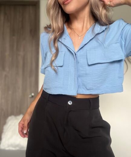 Ref. 053: Blusa corta con bolsillos parche – azul indigo