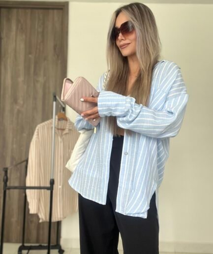 Ref. 068: Camisera oversize con abertura lateral – azul cielo con rayas