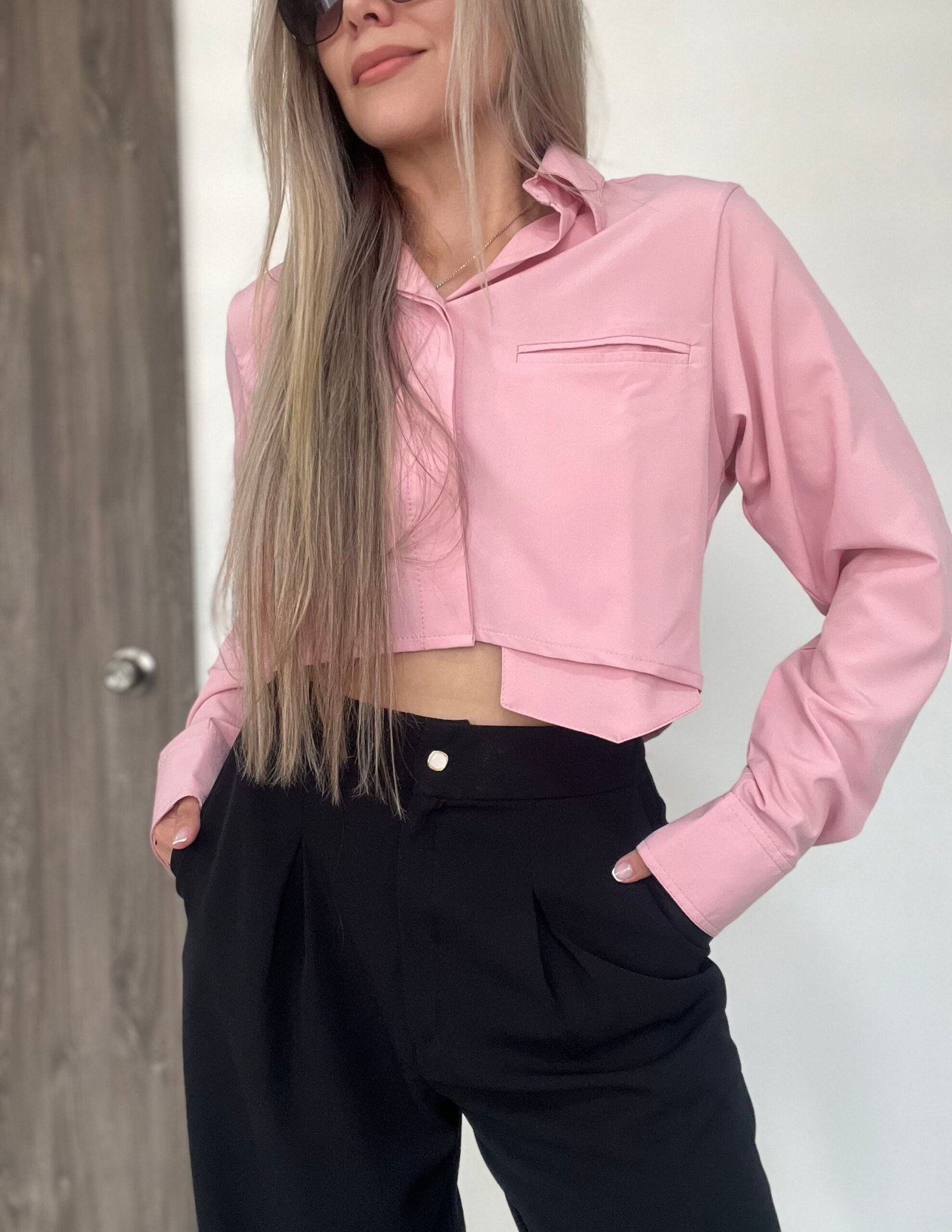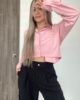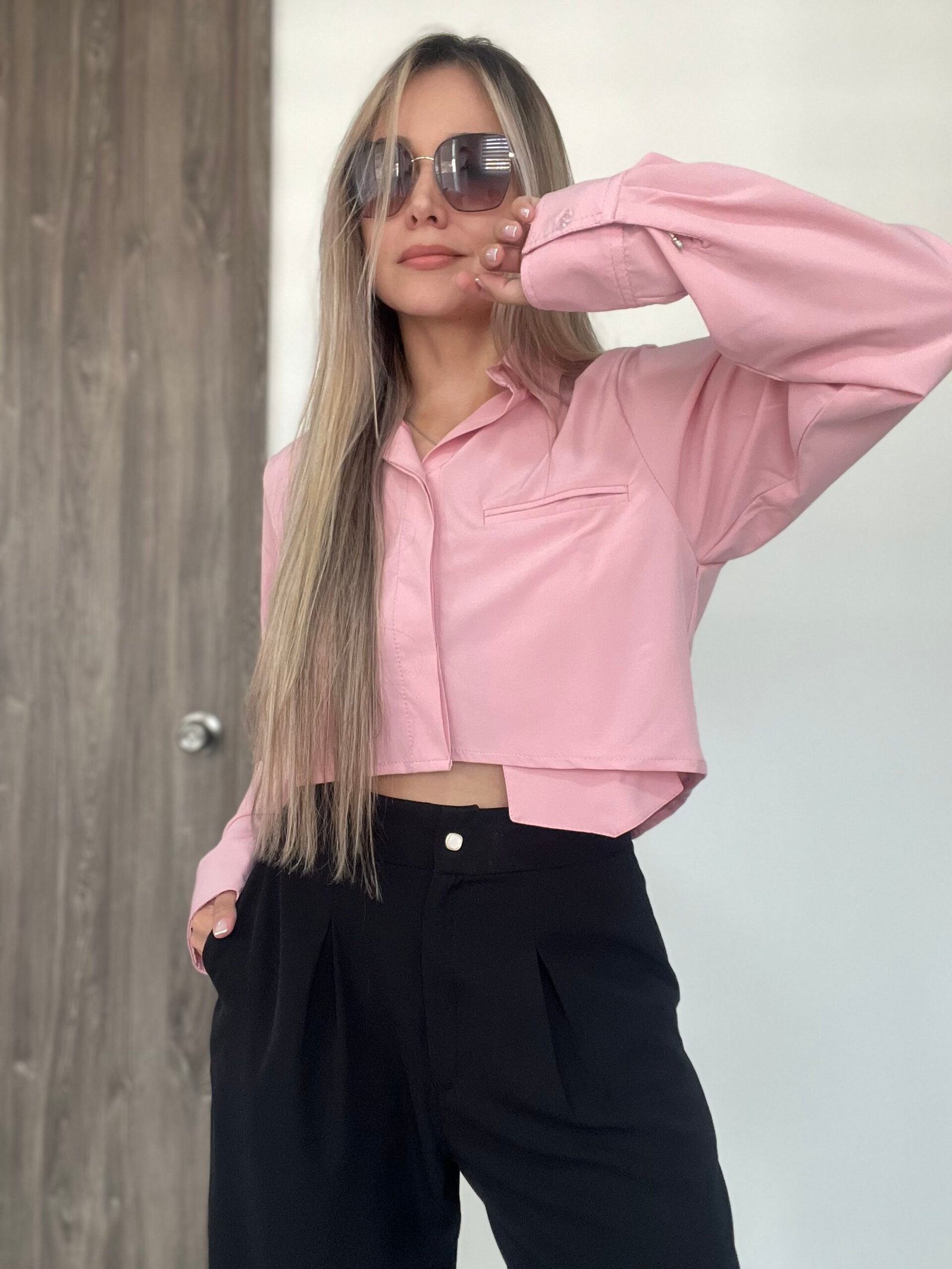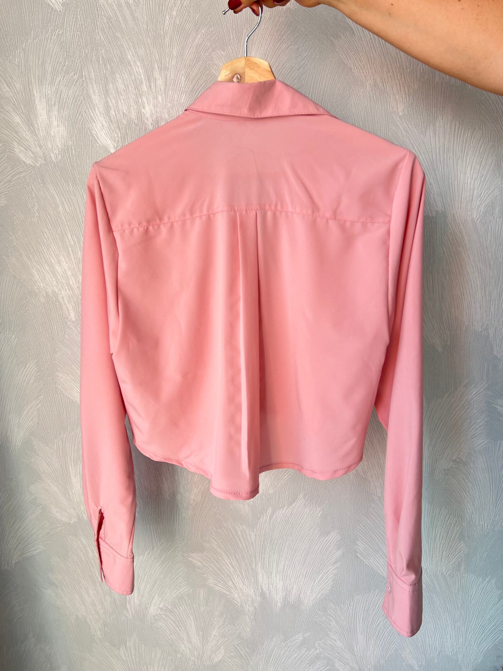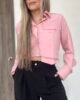 Blusa camisera corta con manga larga, puños y cuello de dos piezas recto. Lleva almilla con prense en la espalda. Su parte posterior es más larga y curva que la delantera. Como detalle tiene un bolsillo delantero en ribete que sobresale en la parte de abajo. Su diseño es ancho. *Las fotos se tomaron con la talla M*.