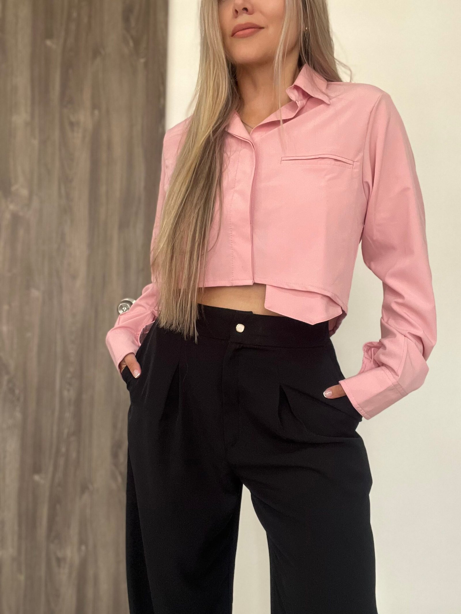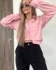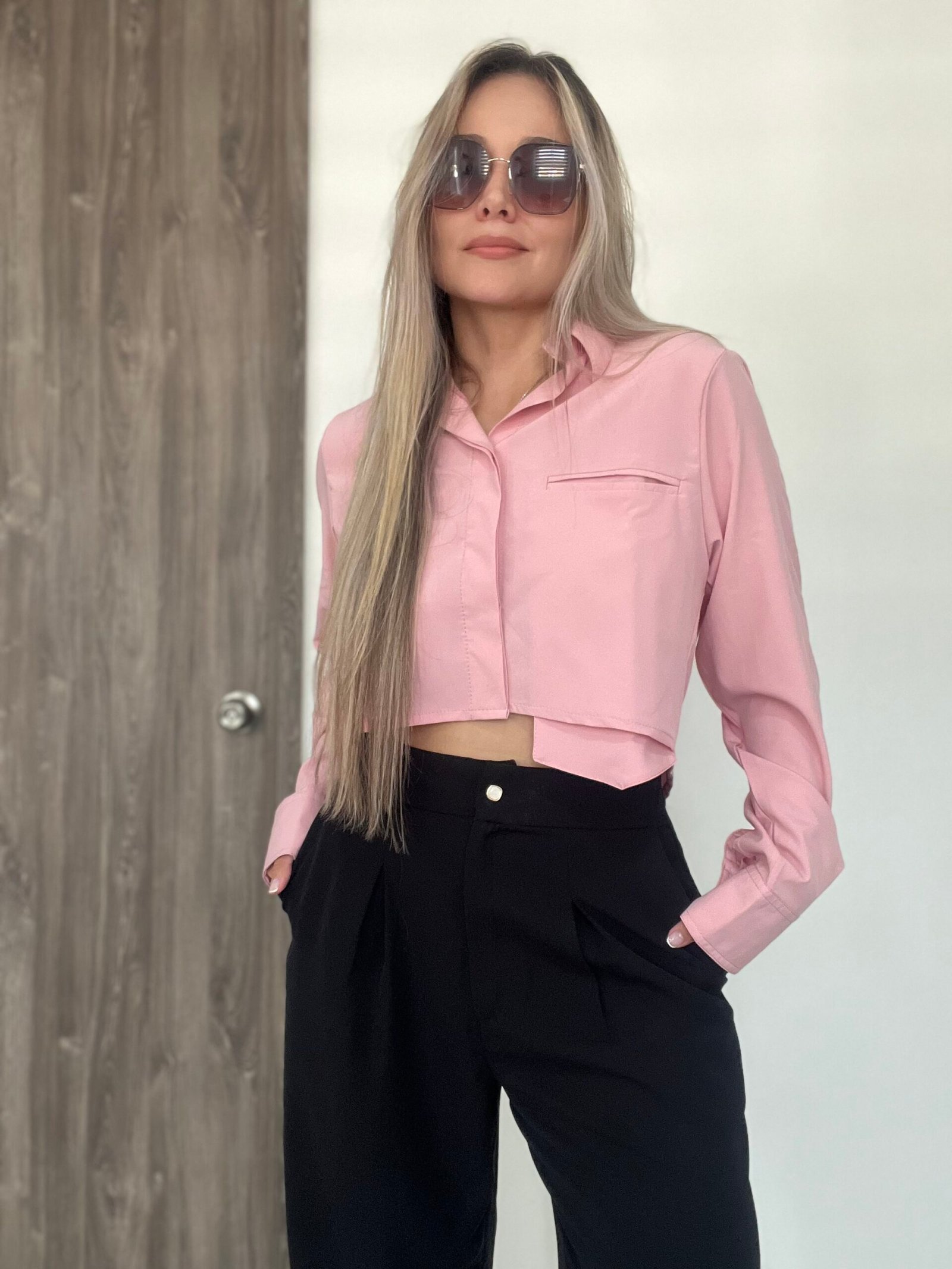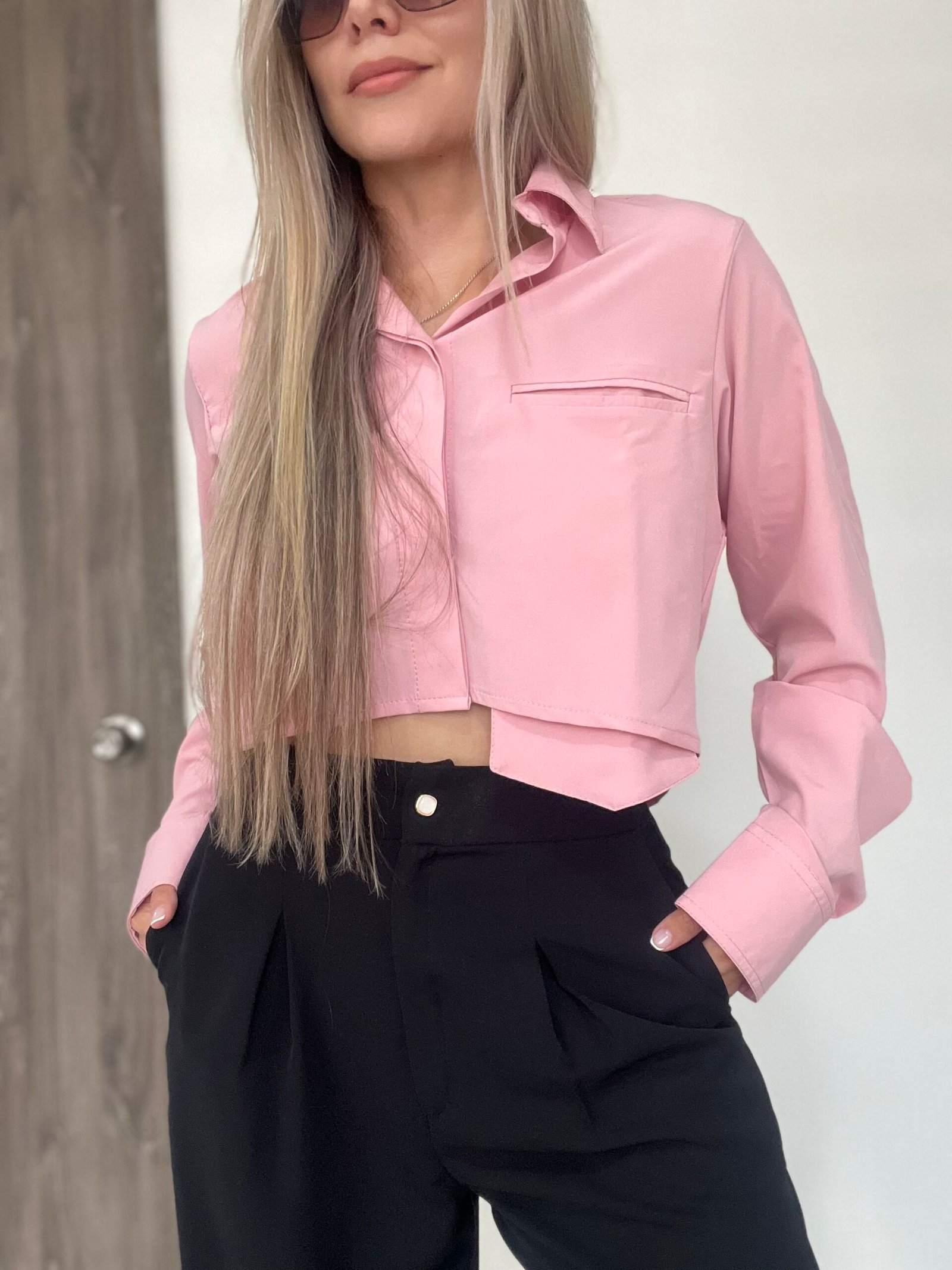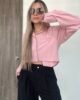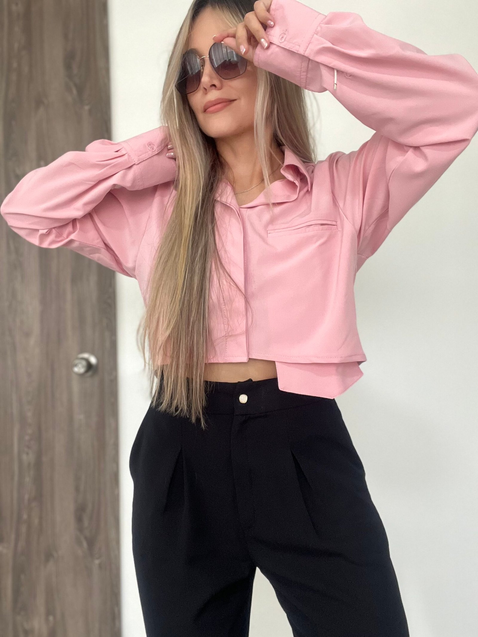 Blusa camisera corta con manga larga, puños y cuello de dos piezas recto. Lleva almilla con prense en la espalda. Su parte posterior es más larga y curva que la delantera. Como detalle tiene un bolsillo delantero en ribete que sobresale en la parte de abajo. Su diseño es ancho. *Las fotos se tomaron con la talla M*.
