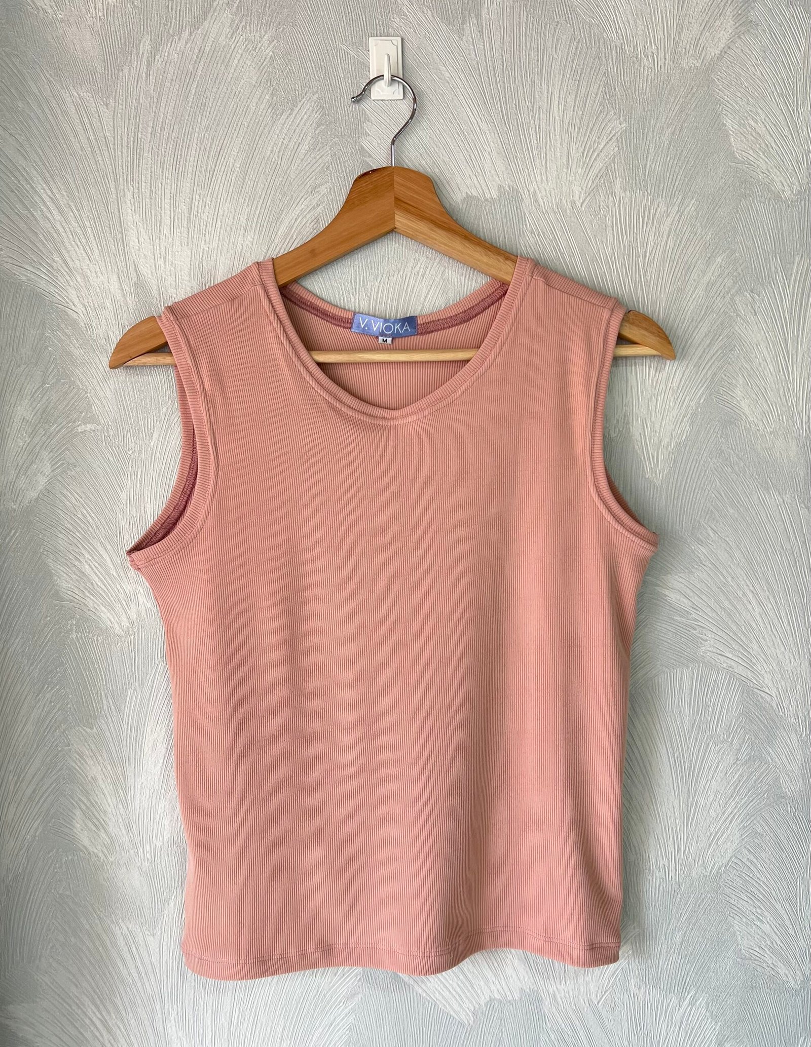Blusa confeccionada en rip. Su diseño es de manga sisa, hombro ancho y cuello redondo. Tiene un largo promedio para usar por fuera o por dentro.