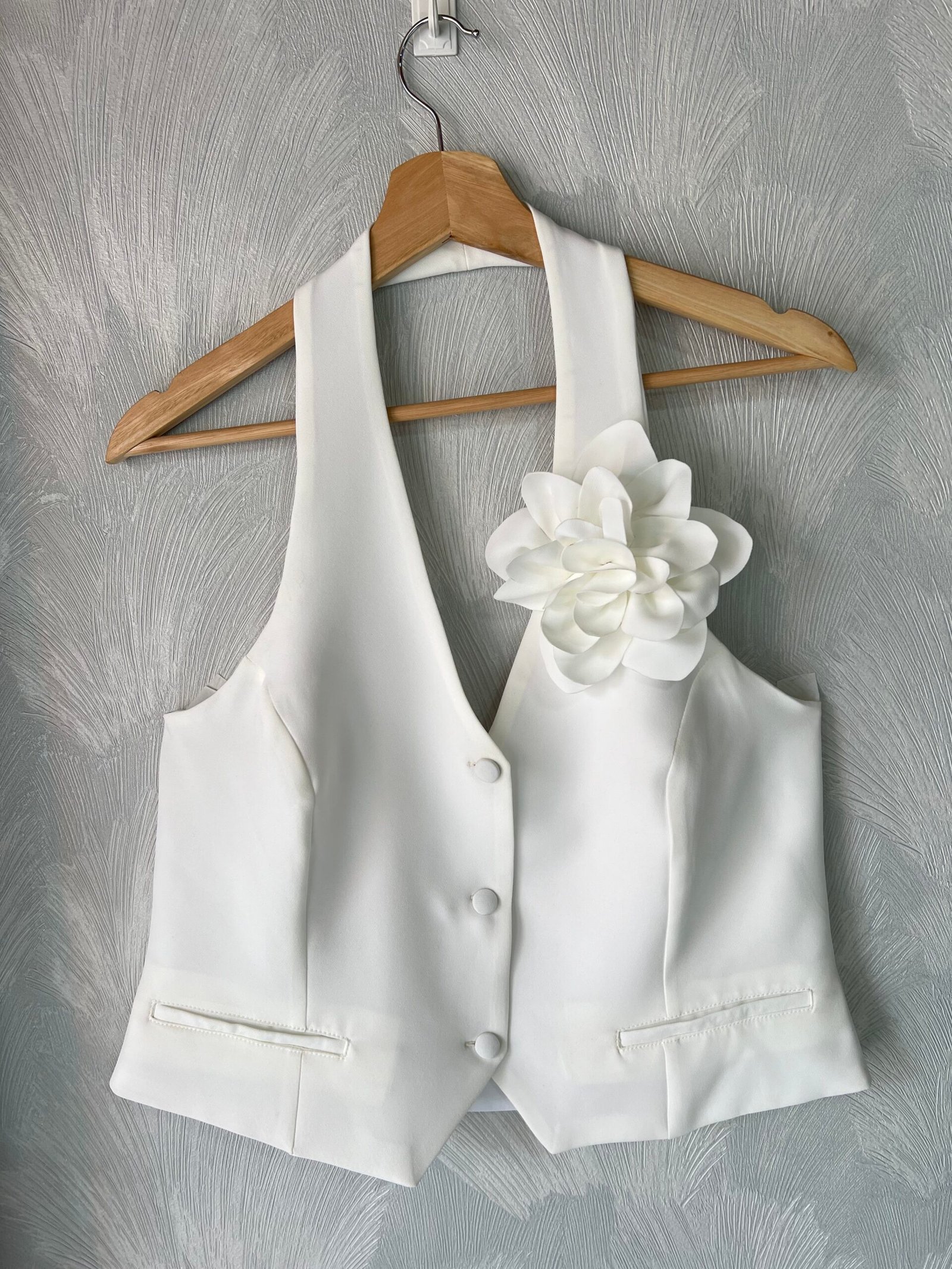 Chaleco con espalda descubierta y cuello en V. Incluye un prendedor artesanal hecho a mano. Lleva forro interno.