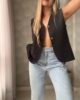 Chaleco es largo que cierra con dos botones en la parte frontal. Tiene cuello en V, y en la parte posterior lleva una pequeña abertura y dos tiras sostenidas con dos botones para darle un detalle especial.
