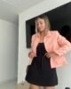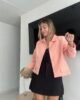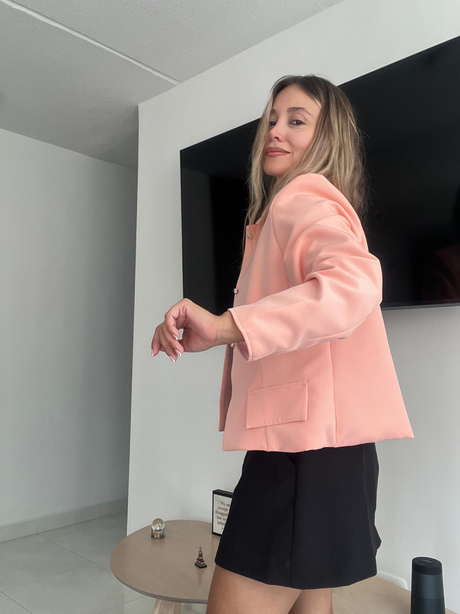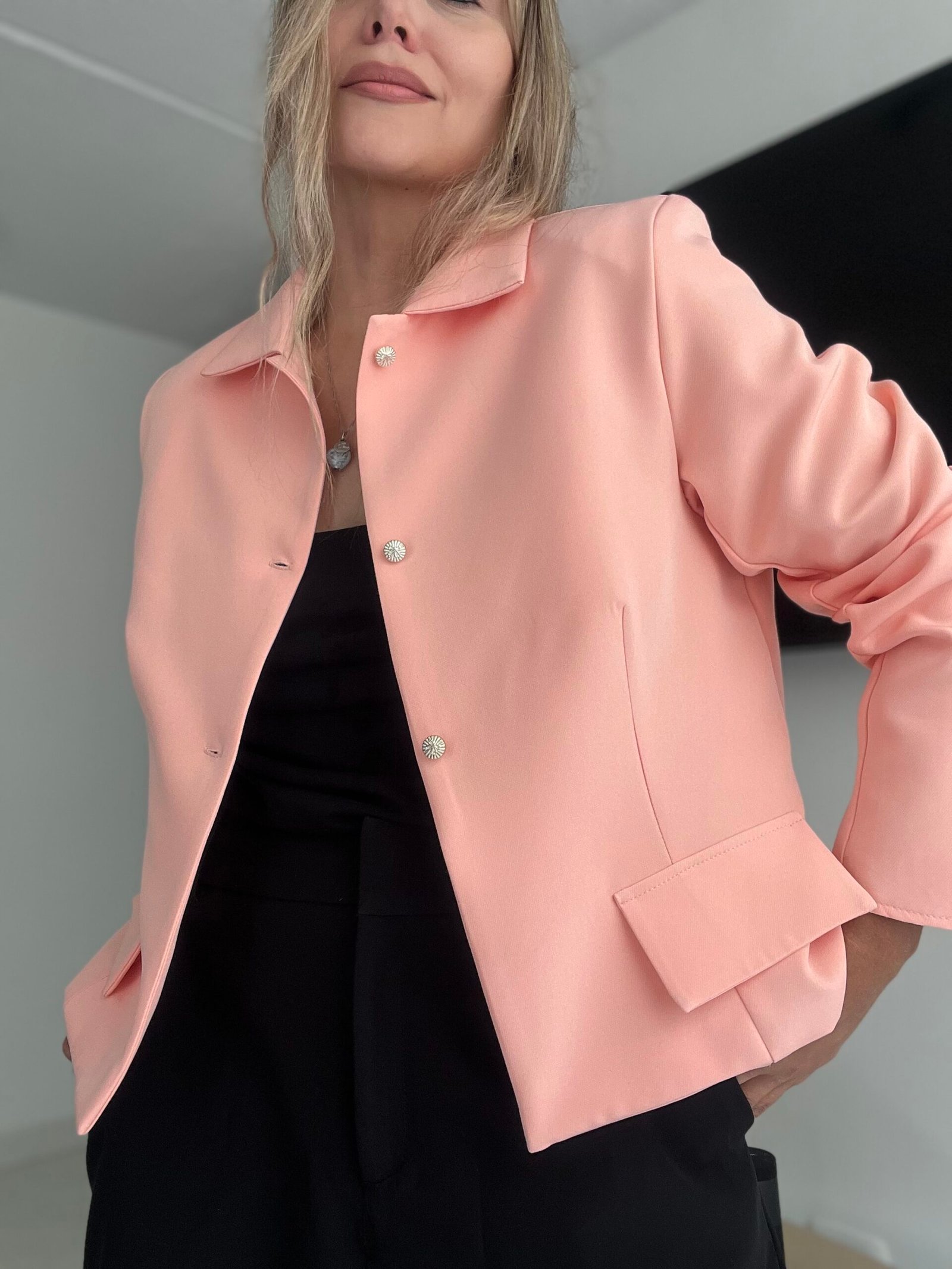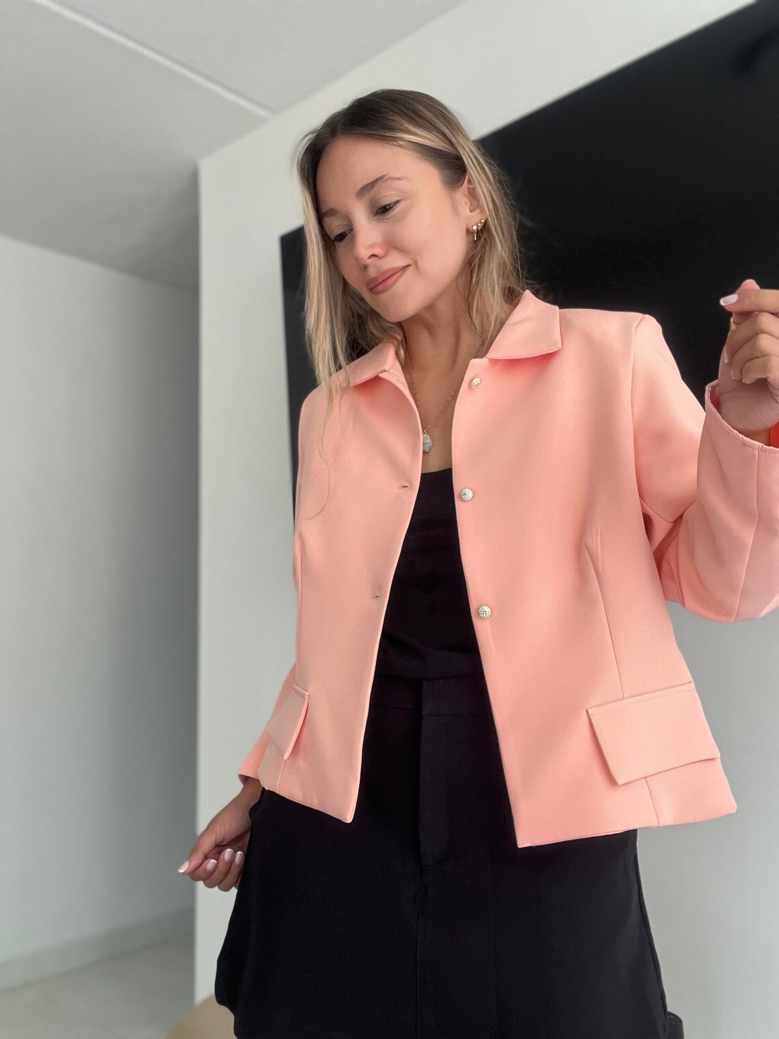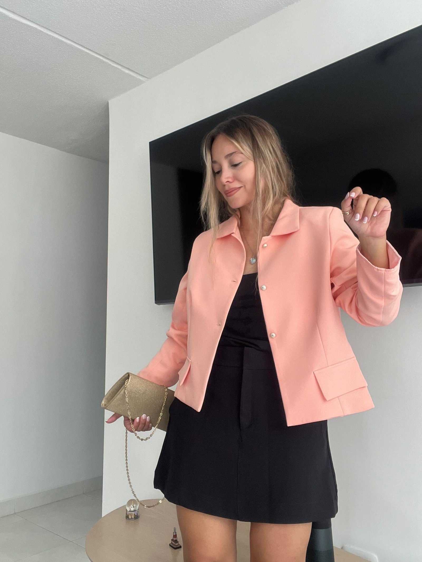 Chaqueta de diseño corto y cuello polo. Lleva dos pinzas y dos tapas delanteras. Incluye 3 botones pequeños de lujo.