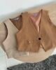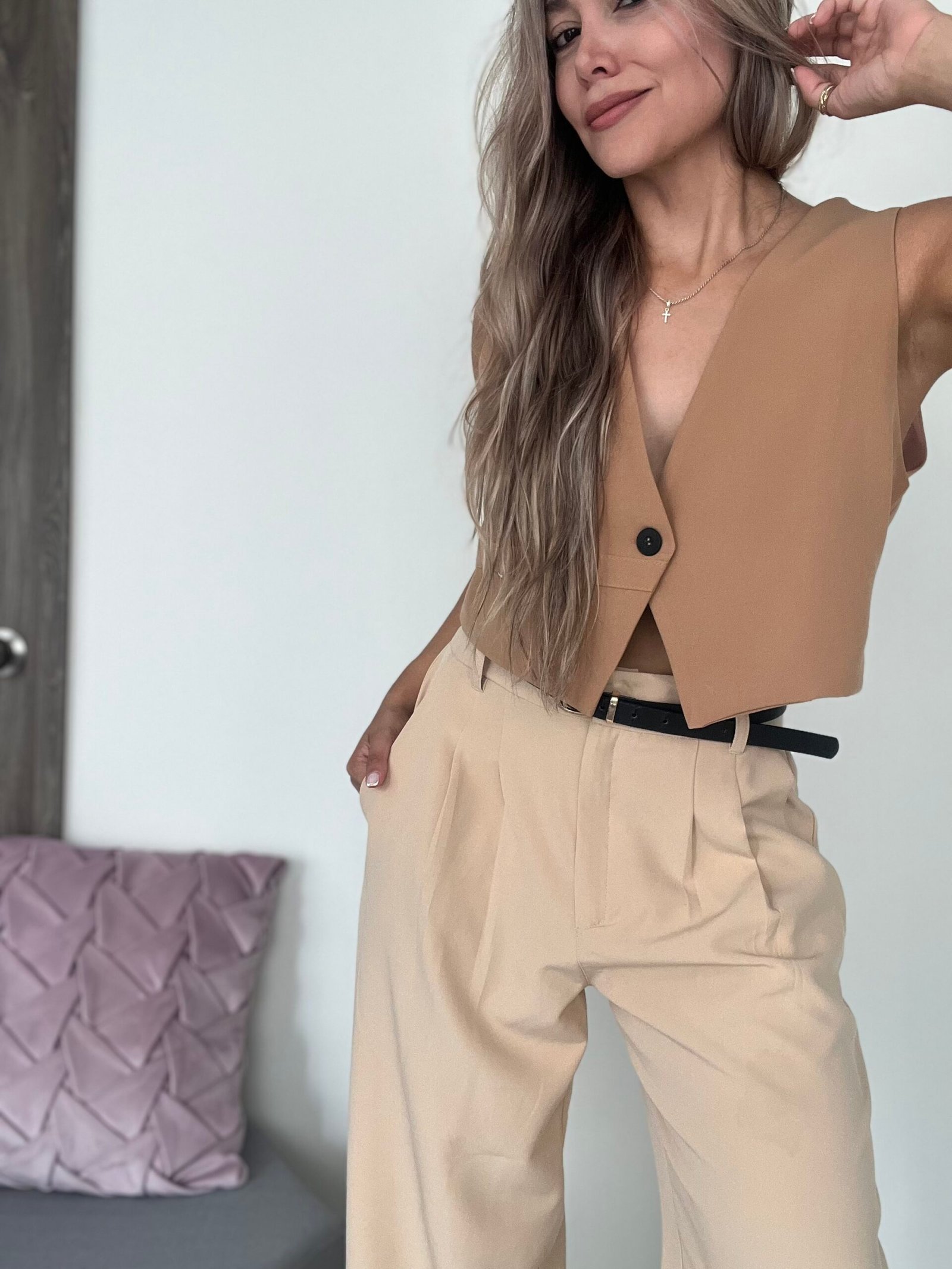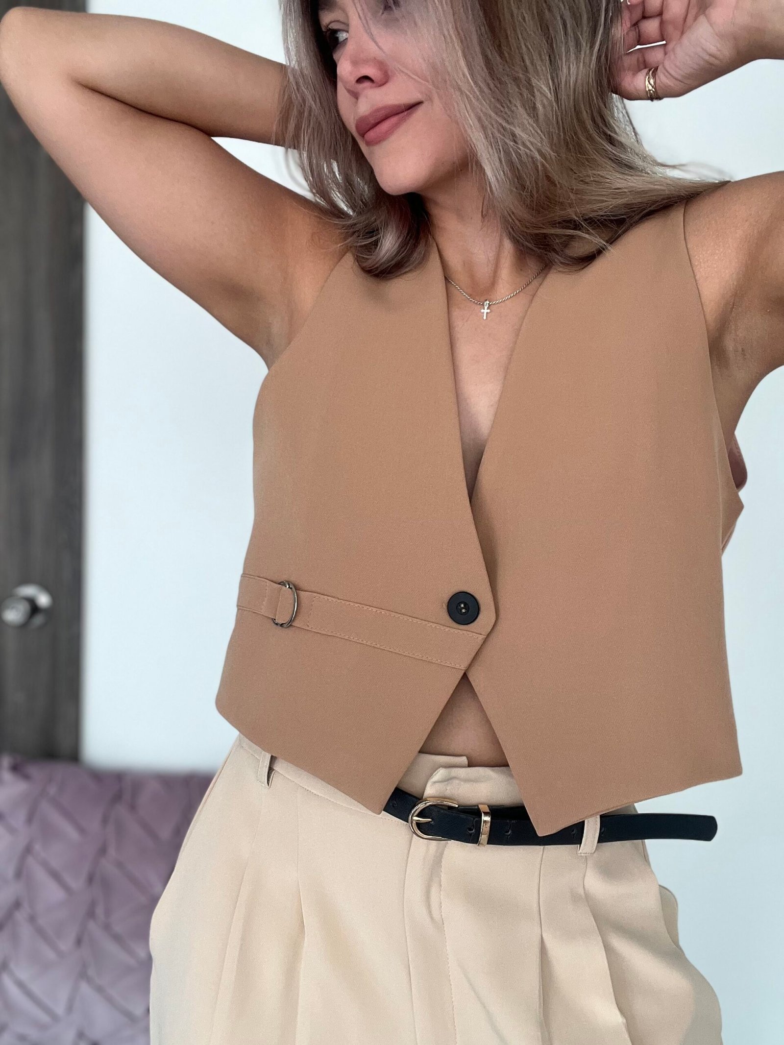 Chaleco corto con cuello en V profundo, cruce en punta, 1 botón, y como detalle, una correílla en la parte frontal sostenida con herraje.