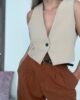 Chaleco corto con cuello en V profundo, cruce en punta, 1 botón, y como detalle, una correílla en la parte frontal sostenida con herraje.