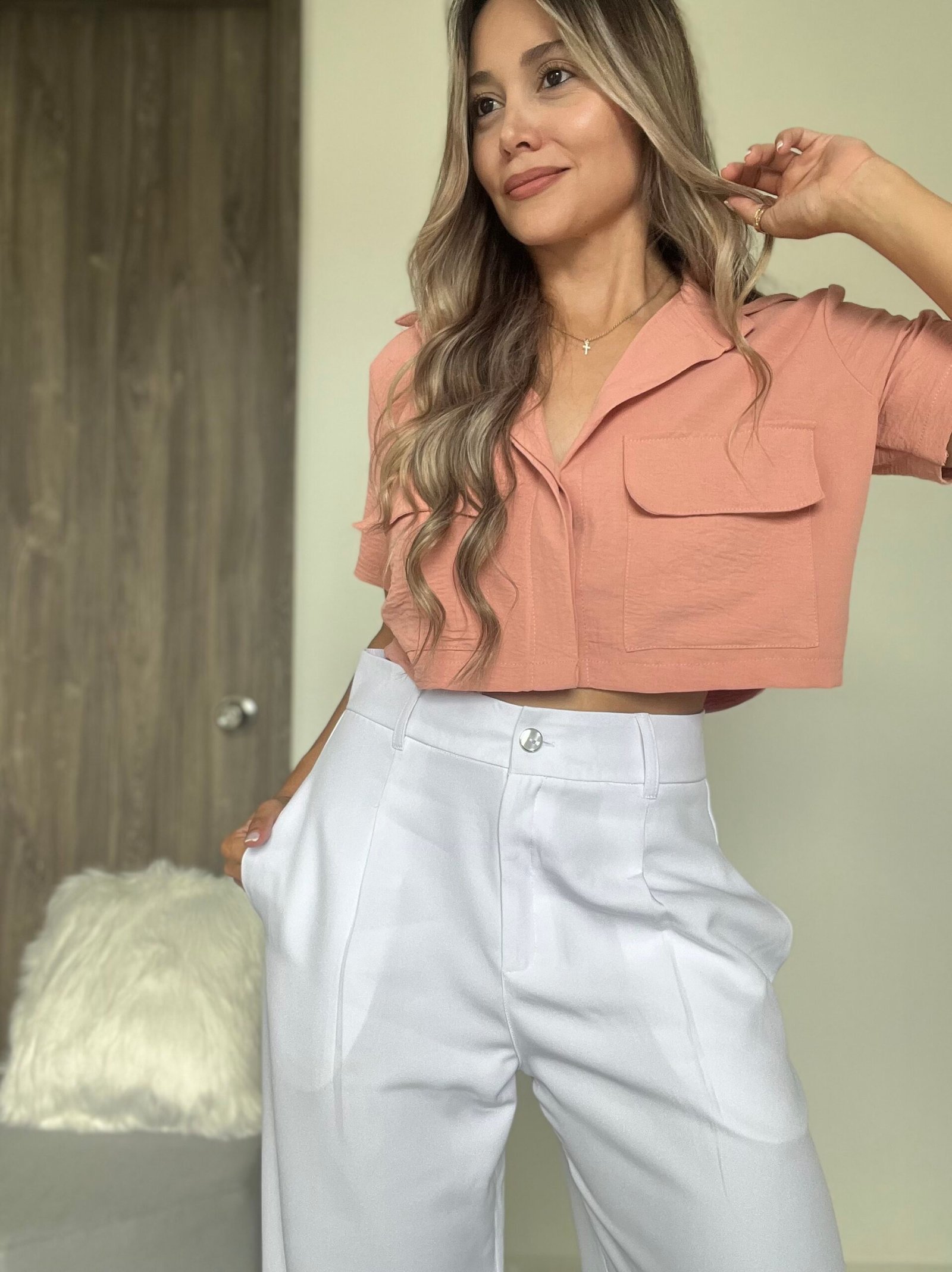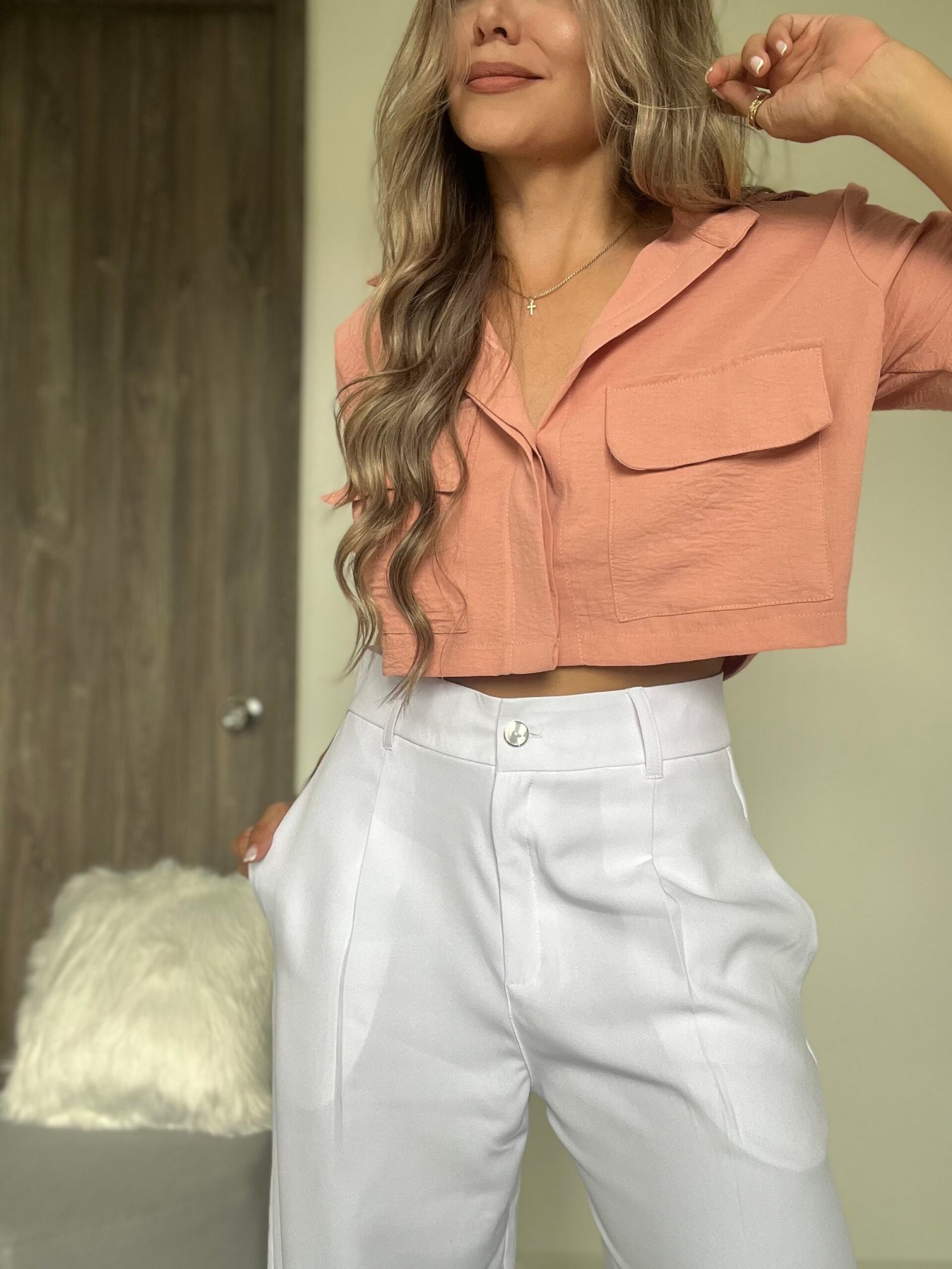 Ref. 053: Blusa corta con bolsillos parche - salmon