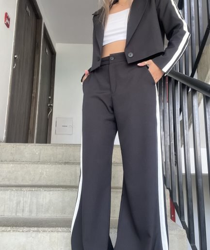 Set formal pantalón con bota semicampana y blazer semiceñido. El traje no es completamente pegado, pero si tiene una horma ligeramente ceñida. Está confeccionado en un lino con apariencia elegante. El blazer incluye forro interno, un botón forrado y sus hombnreras son hechas a mano por esta misma marca, por lo que son sutiles (no son exageradas), livianas, y justas a la medida (no se sienten). Las mangas terminan con una pequeña abertura que da apariencia de modernidad y resultan muy cómodas al momento de doblarlas.