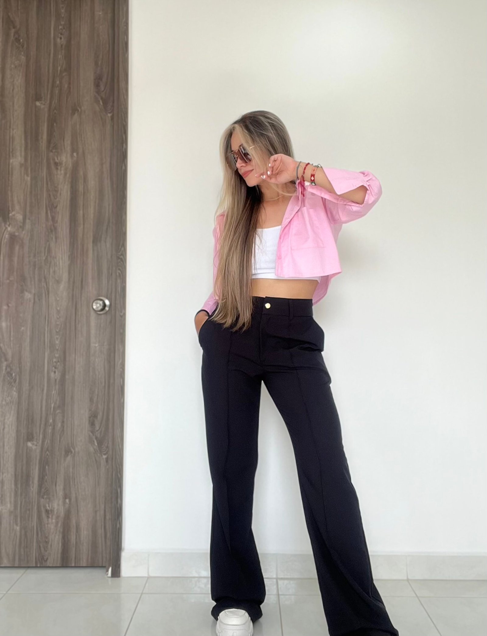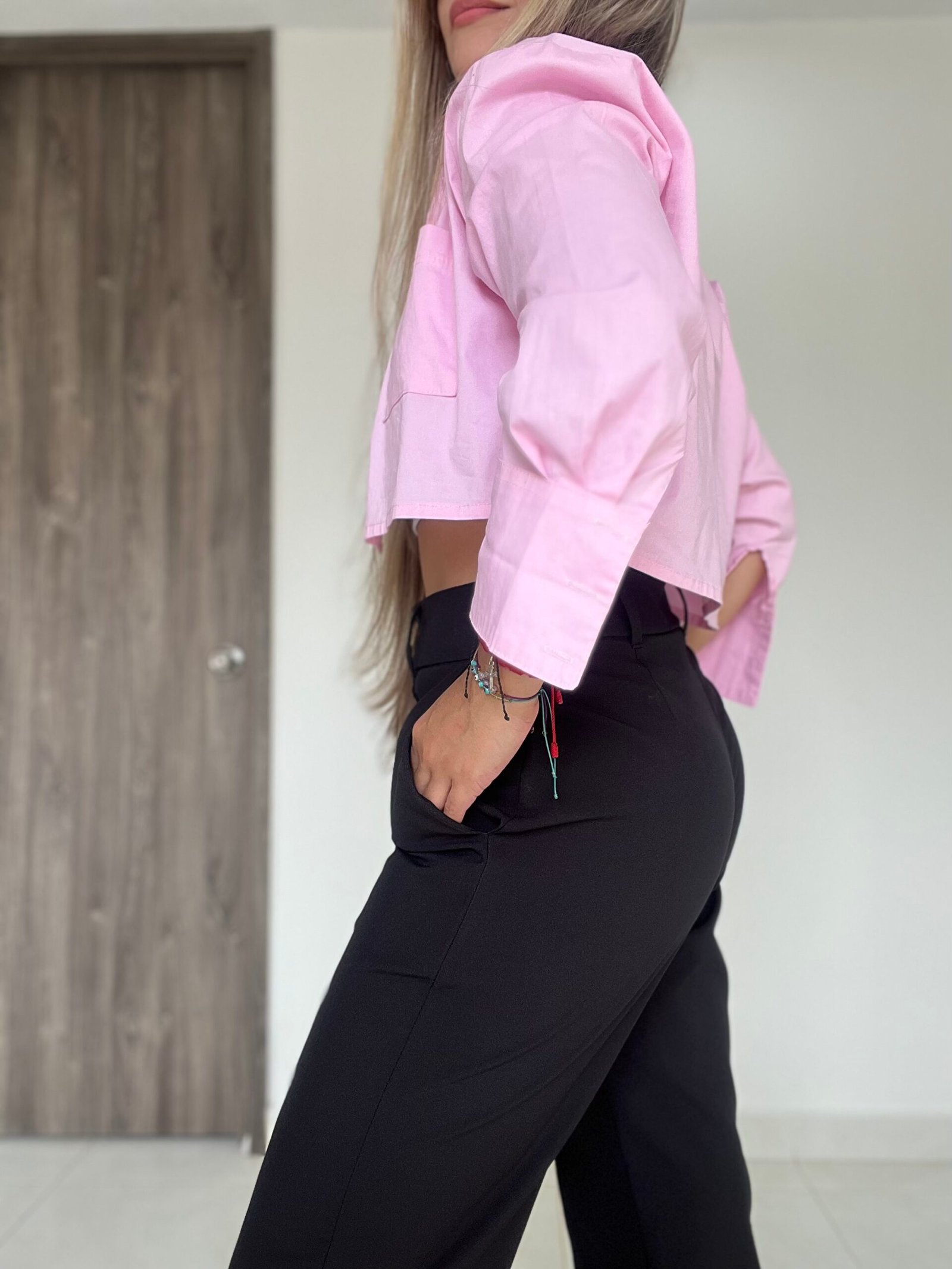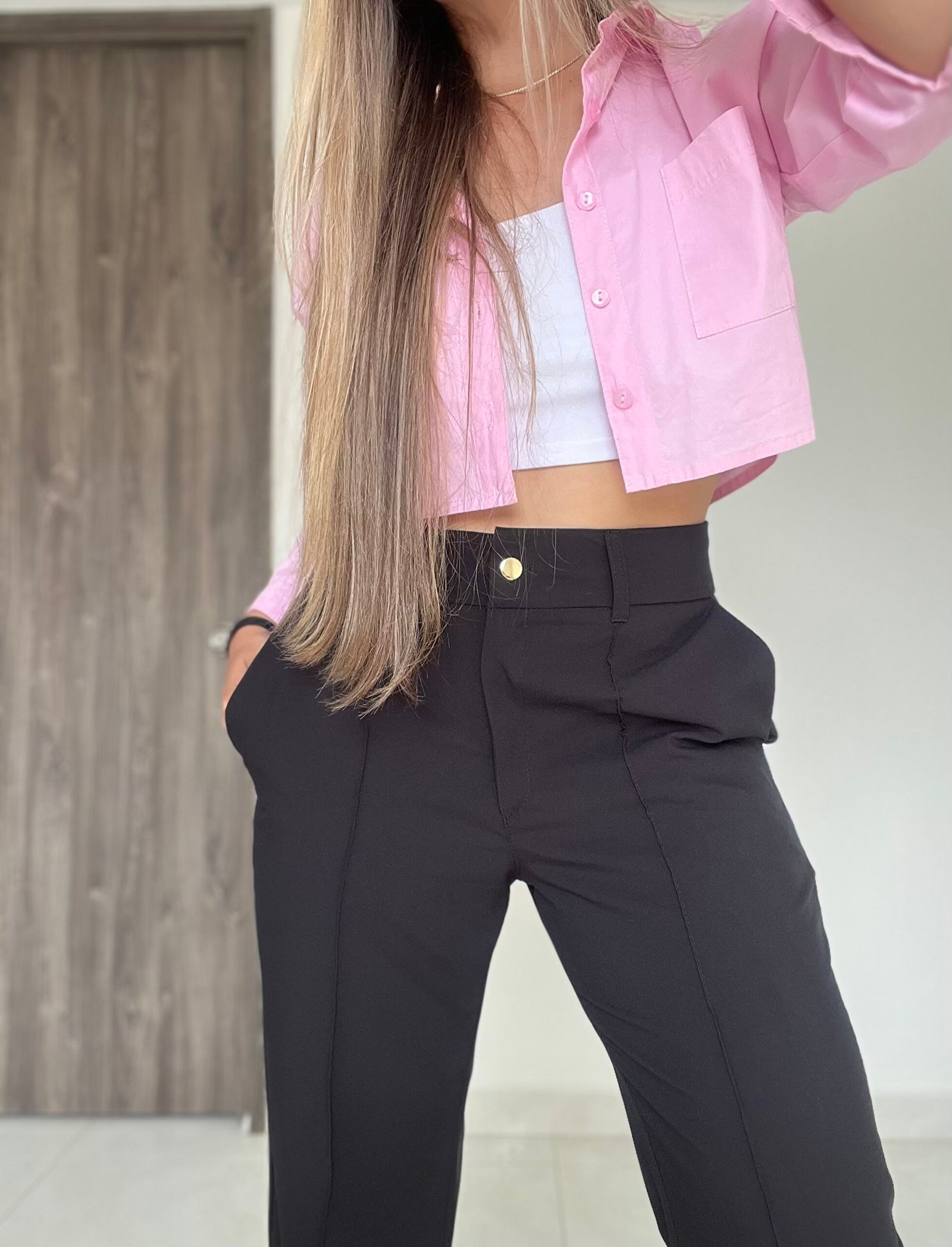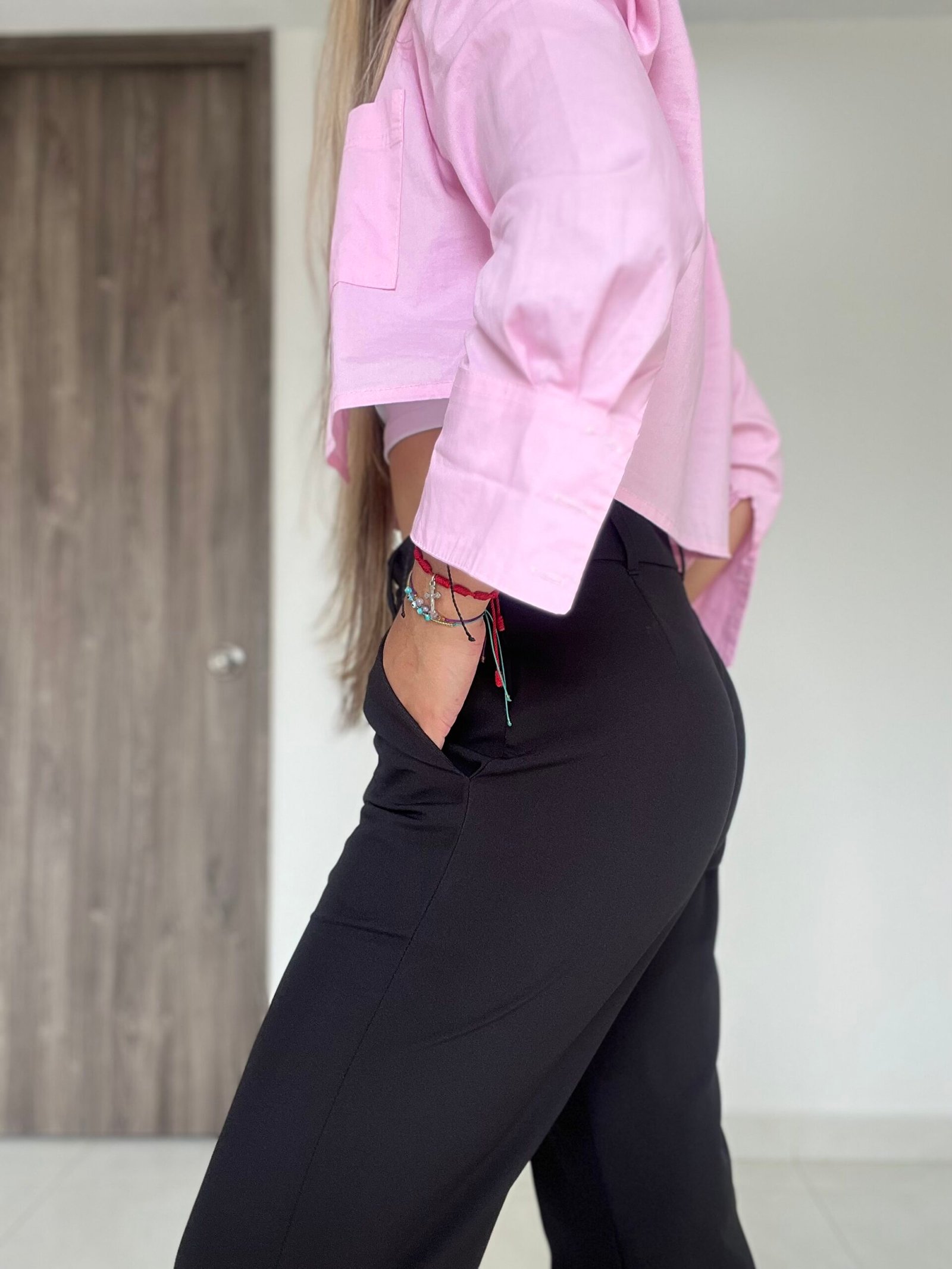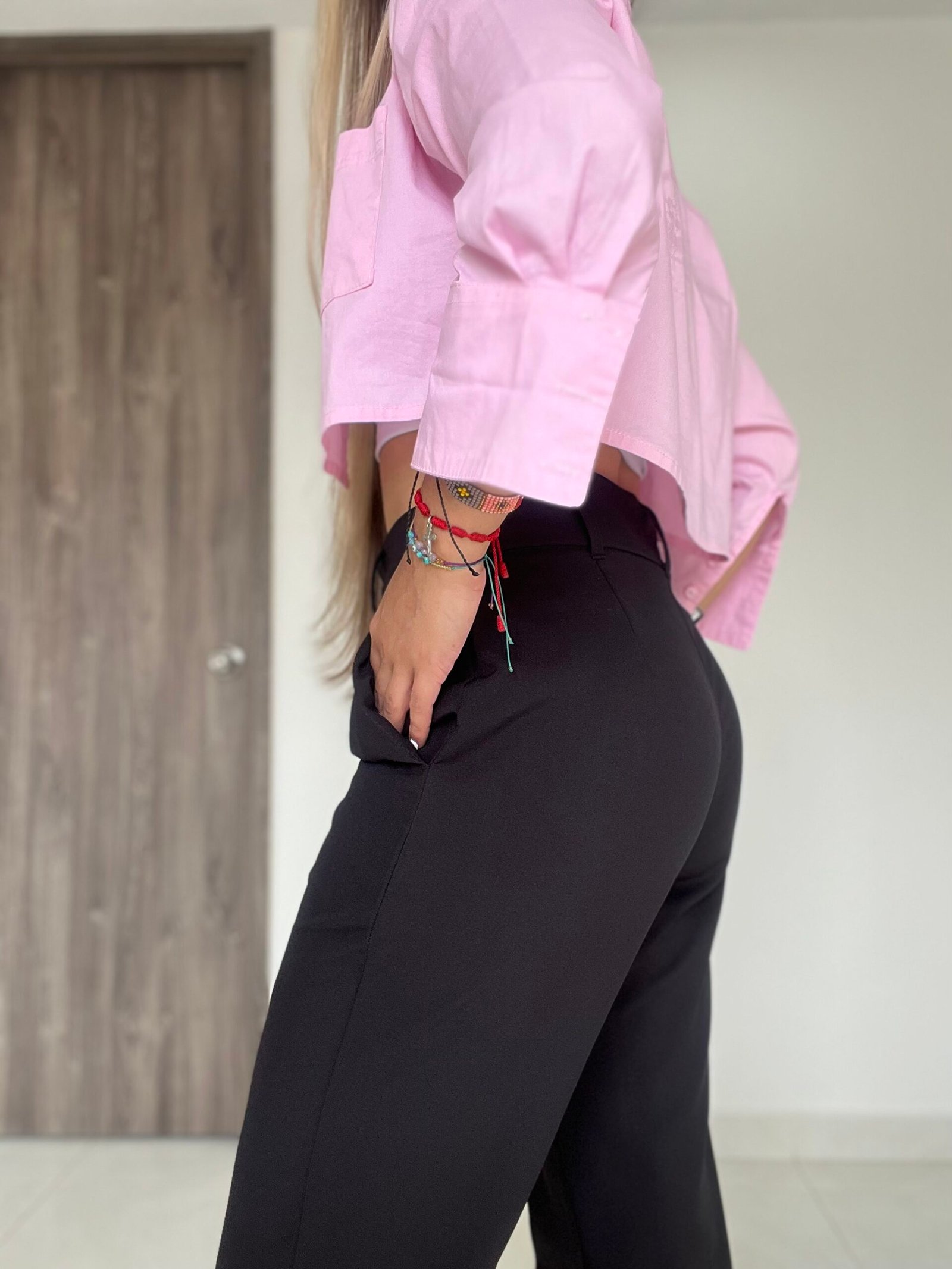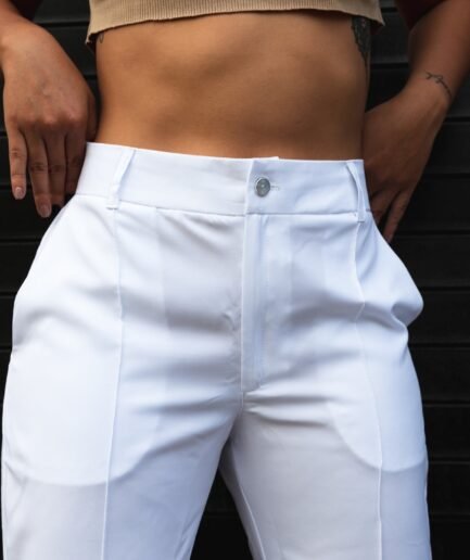 Pantalón clásico semi-campana con vena frontal en ambos lados, bolsillos delanteros en diagonal y una pretina con diseño anatómico que permite acentuar mejor la cintura. Tiene 4 centímetros de ruedo para aumentar o disminuir el largo según la estatura de la persona. está confeccionado en una tela lino muy suave al tacto, delgada, y bastante liviana.