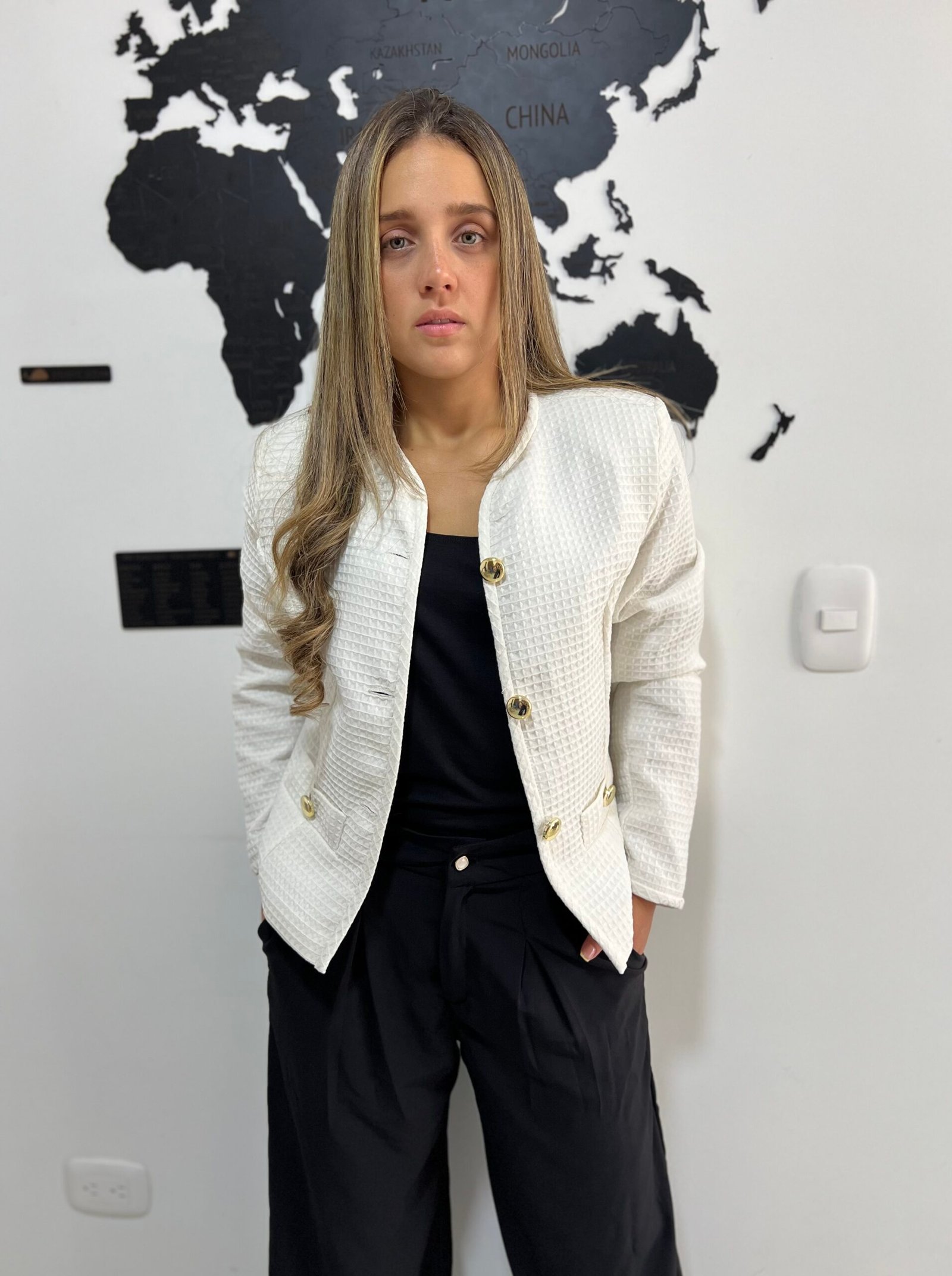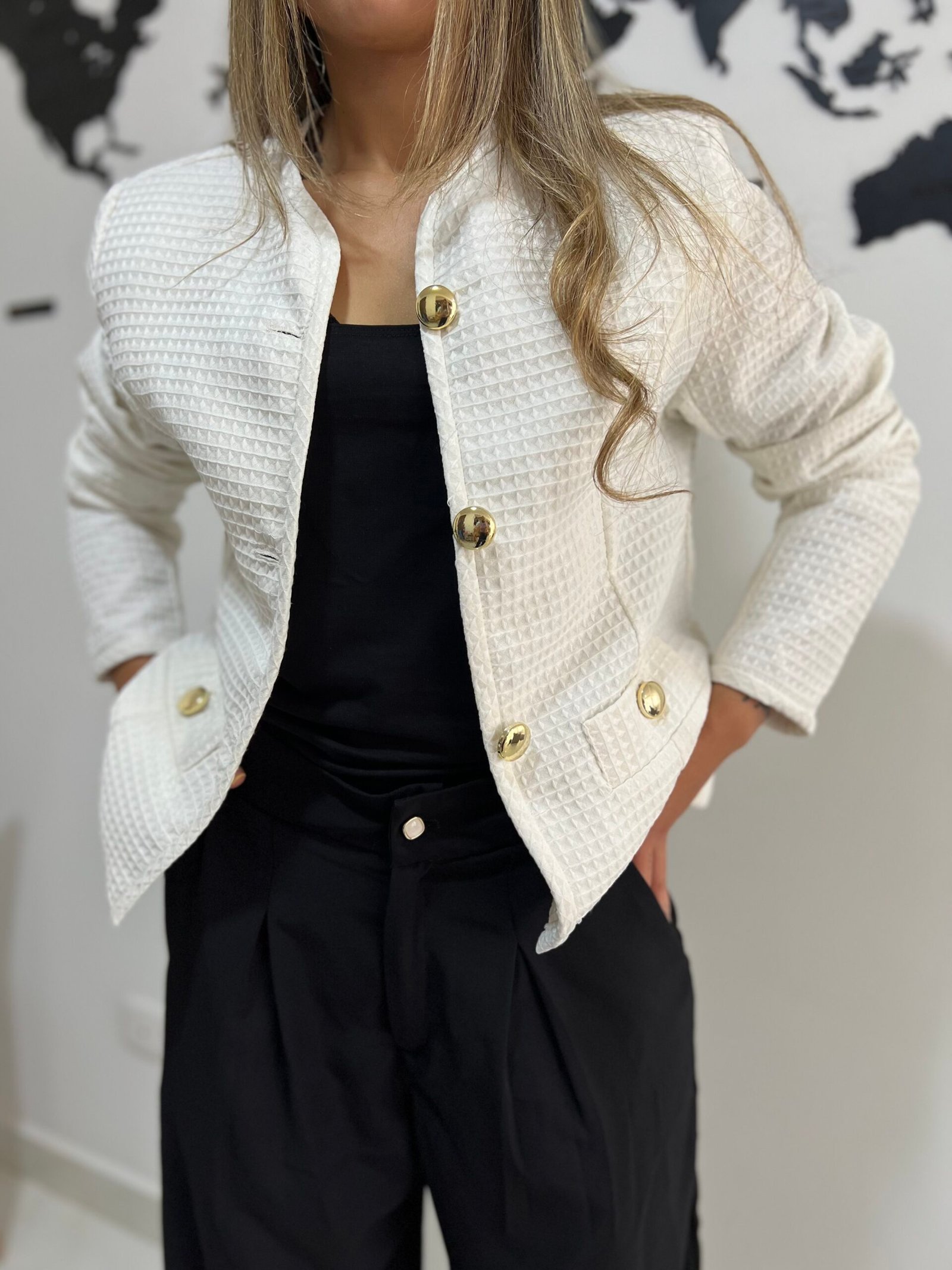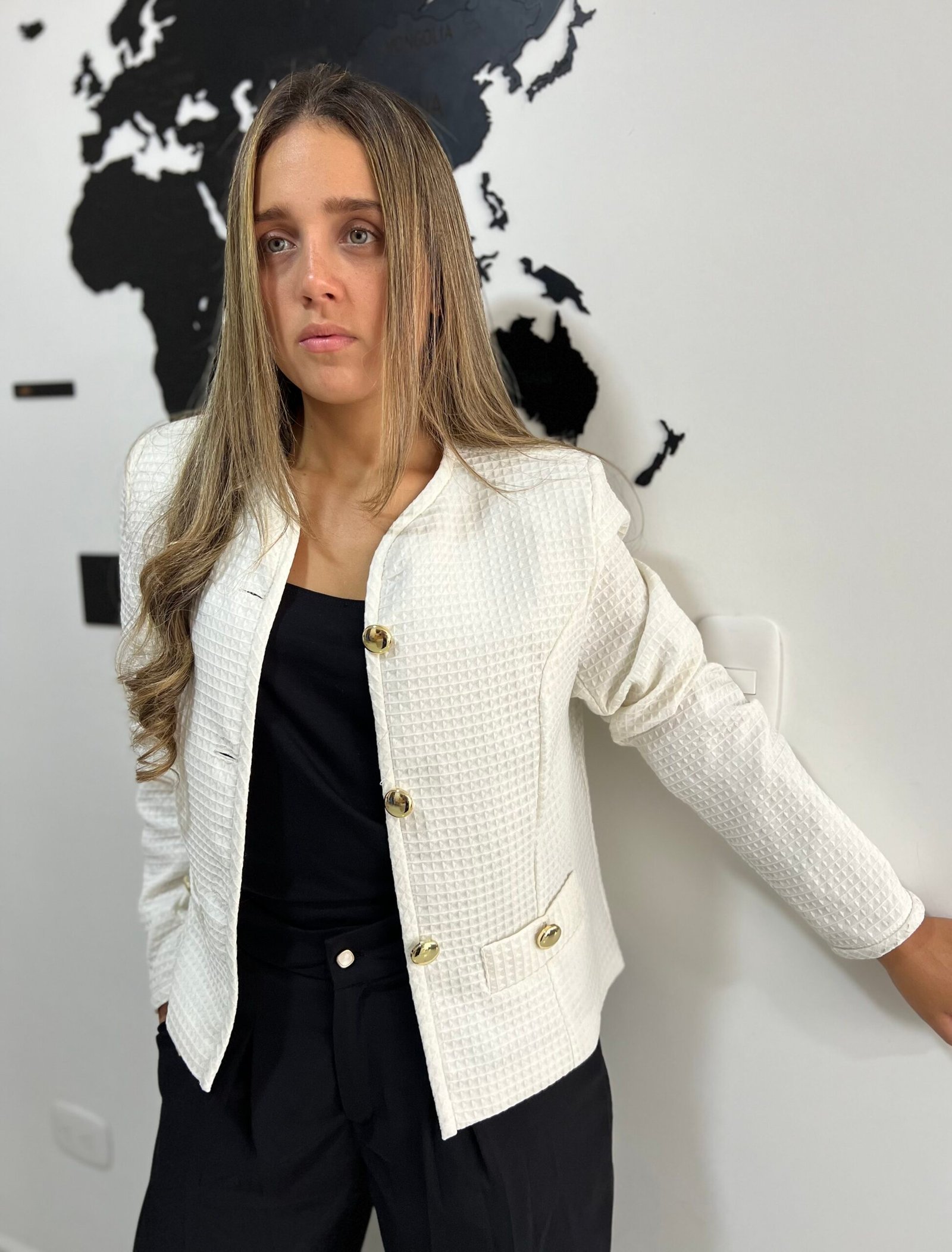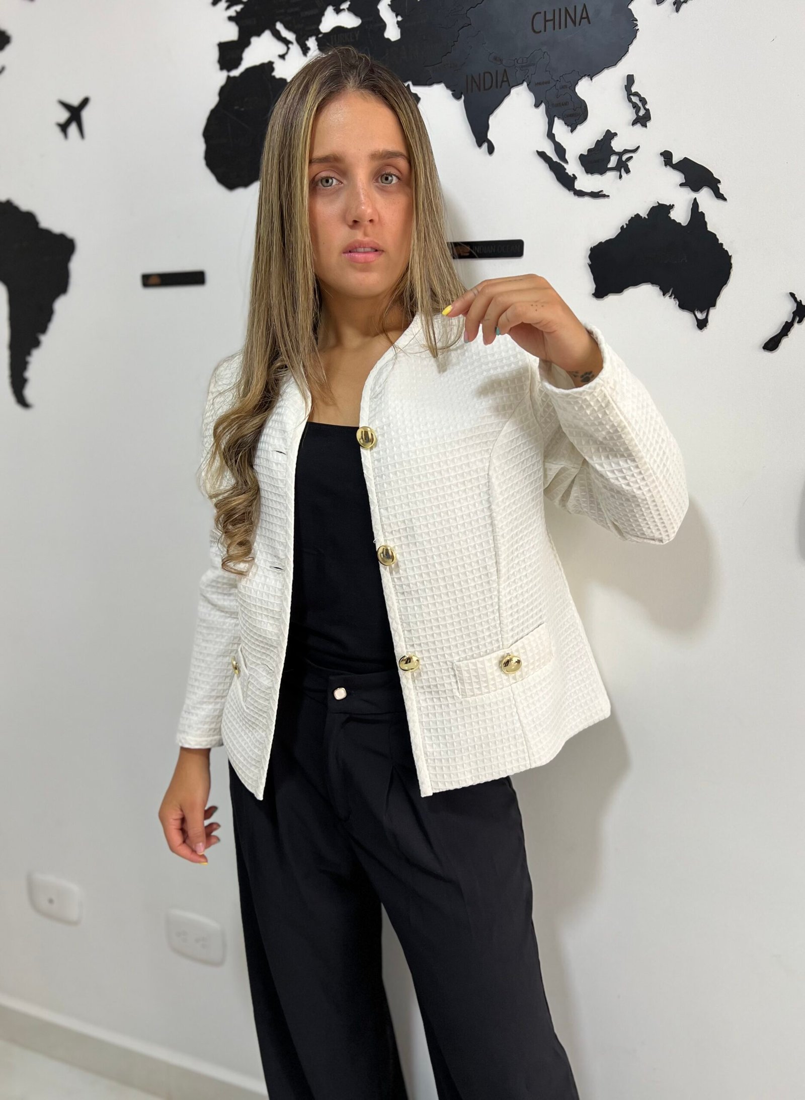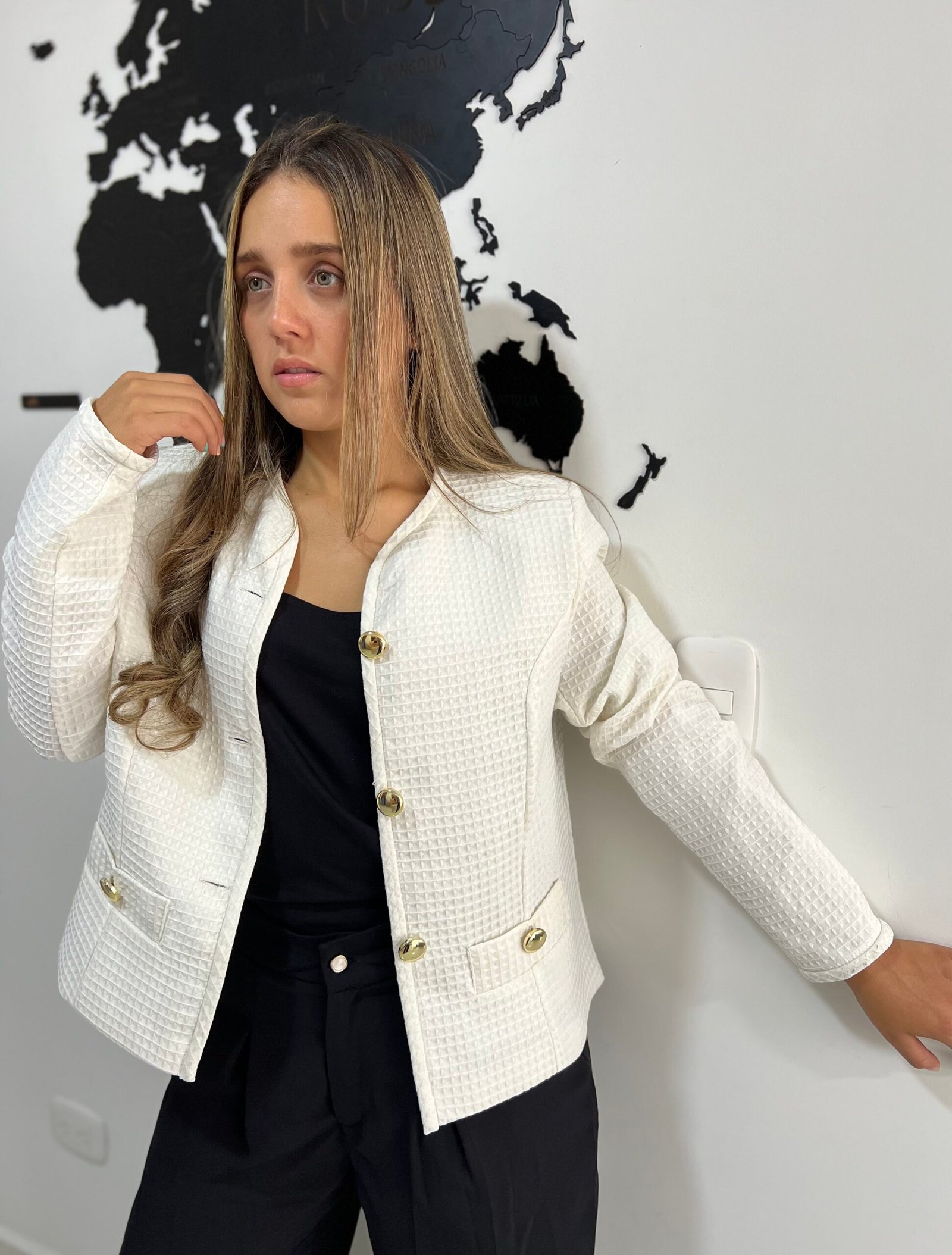Chaqueta tipo Chanel con cuello redondo y dos bolsillos de ribete ancho. Como detalle va sesgado en cuello y puños dando una apariencia de cordón. Cuenta con cinco botones dorados: Tres frontales y uno en cada bolsillo. Está confeccionada en un lino liviano con apariencia de panal de miel. Lleva forro interno. *Las fotos se tomaron con la talla M*