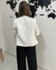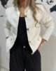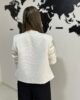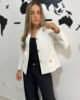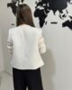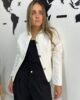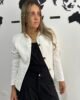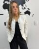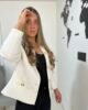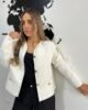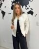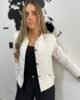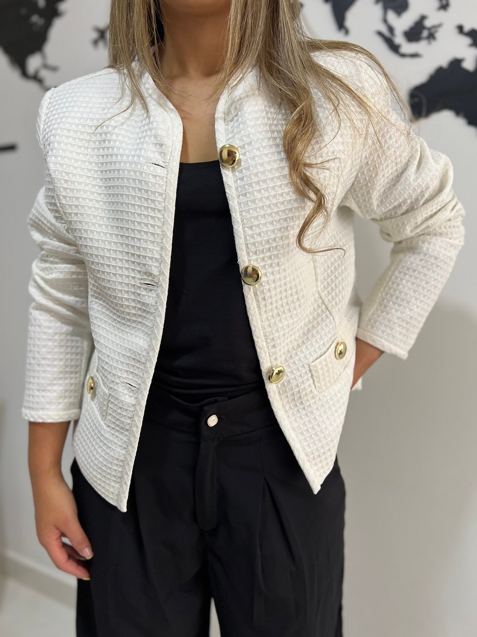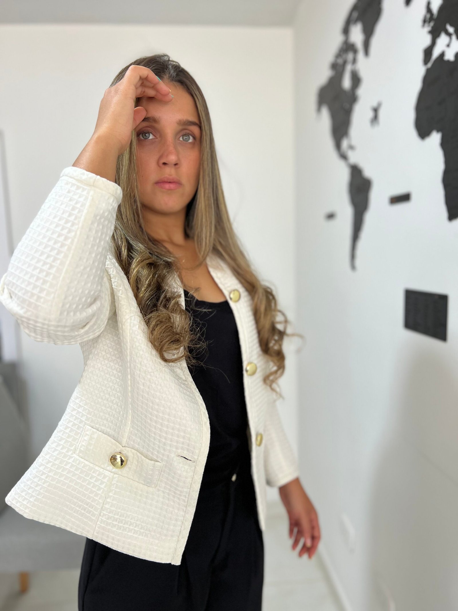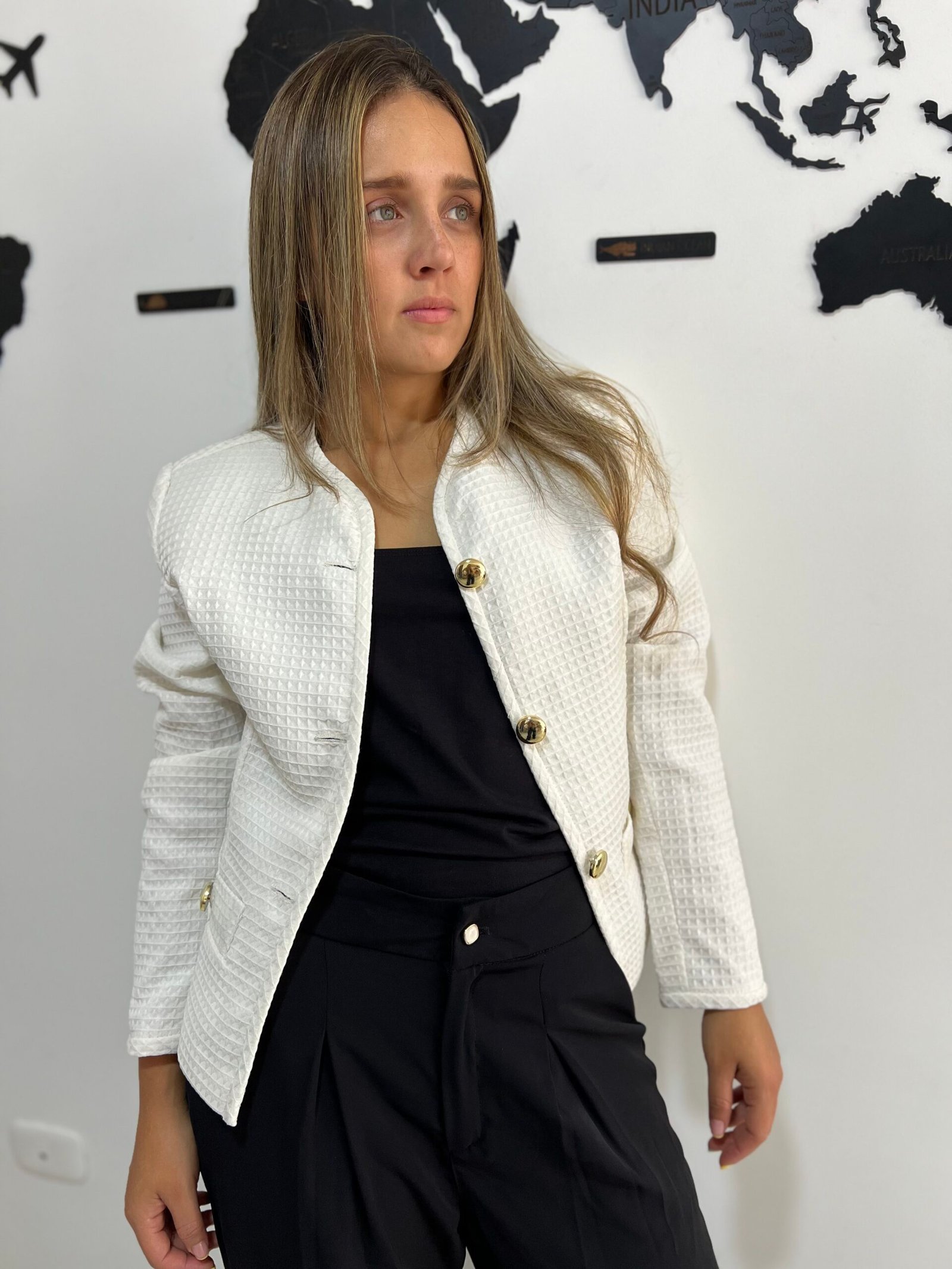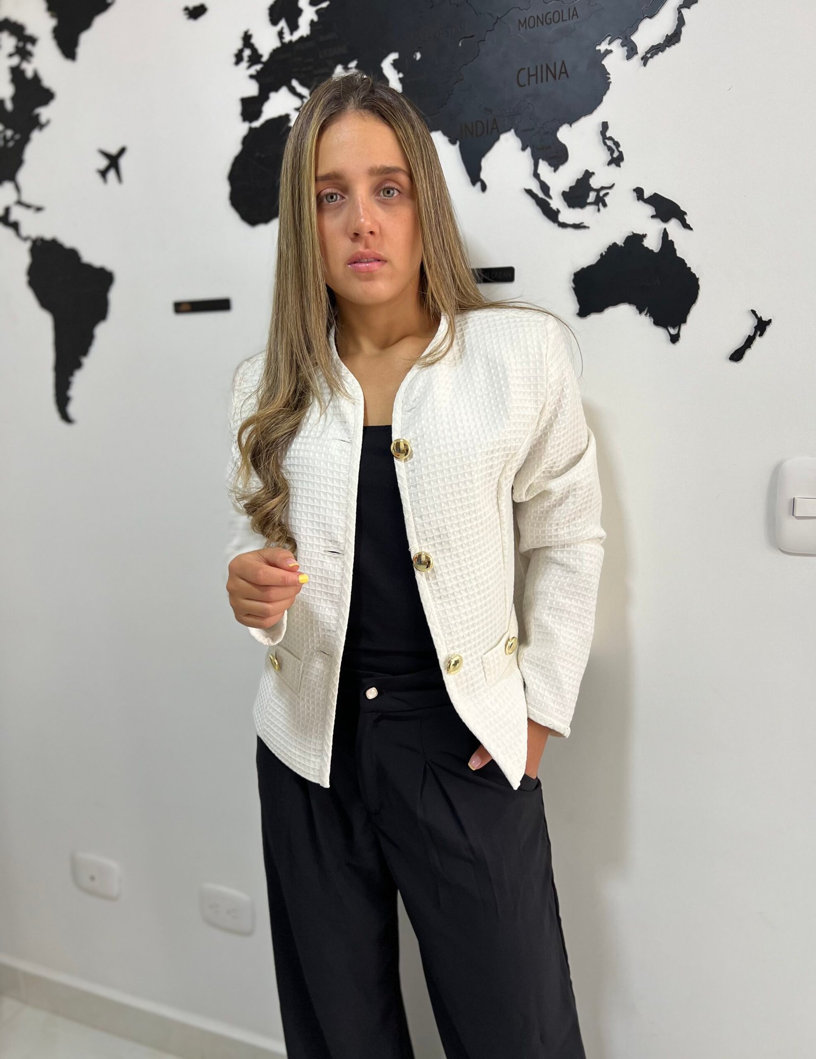 Chaqueta tipo Chanel con cuello redondo y dos bolsillos de ribete ancho. Como detalle va sesgado en cuello y puños dando una apariencia de cordón. Cuenta con cinco botones dorados: Tres frontales y uno en cada bolsillo. Está confeccionada en un lino liviano con apariencia de panal de miel. Lleva forro interno. *Las fotos se tomaron con la talla M*