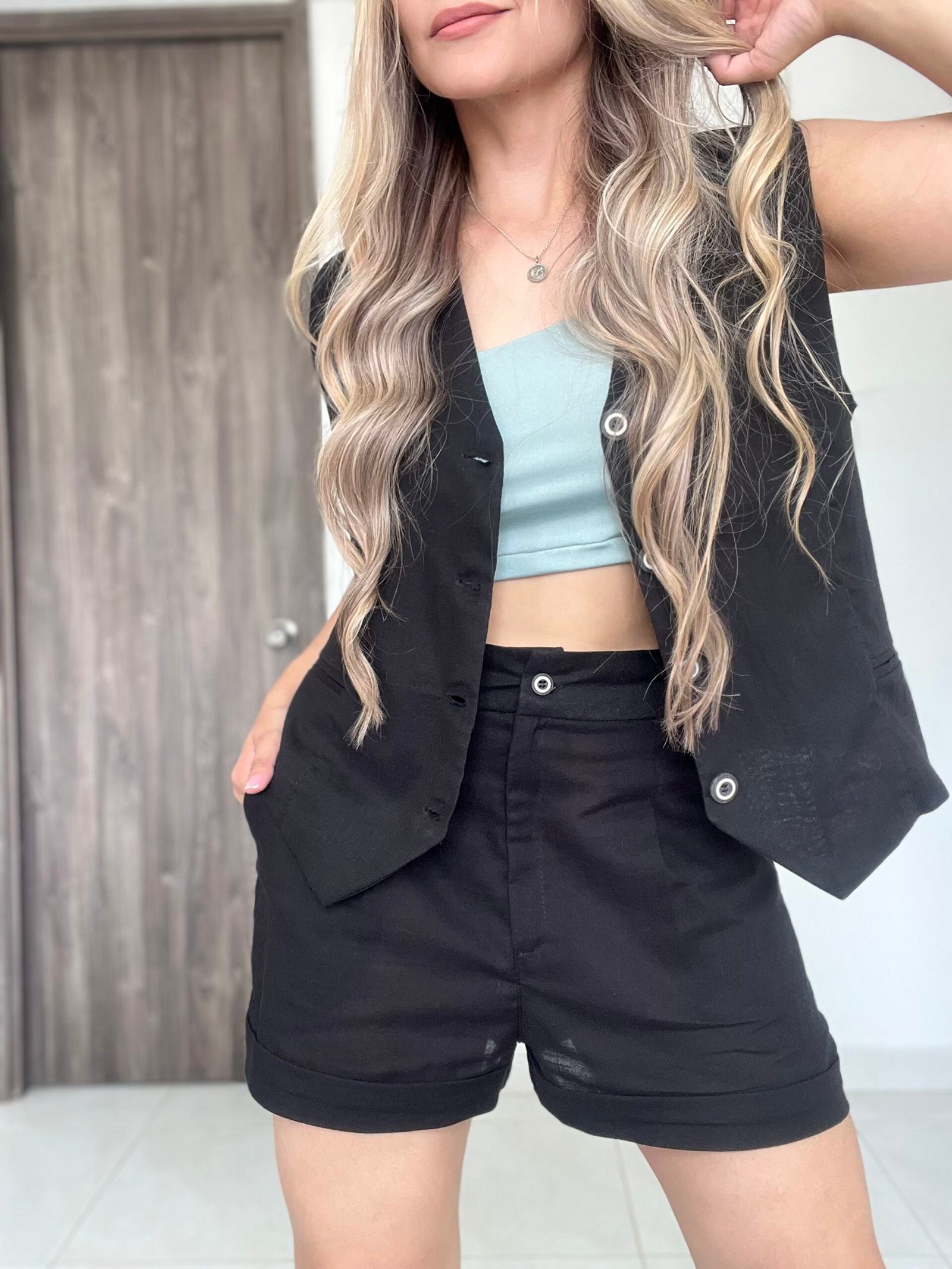 Set conformado por chaleco y short. El chaleco tiene un diseño con cortes delantero y trasero, bolsillo falso en ojal y cuello en v. Incluye forro interno. El short tiene un diseño con prenses, bolsillos diagonal, pretina anatómica y un ruedo tipo sastre. Ambas piezas están confeccionadas en una tela de mezcla lino y algodón que se caracteriza por ser muy fresca y liviana.